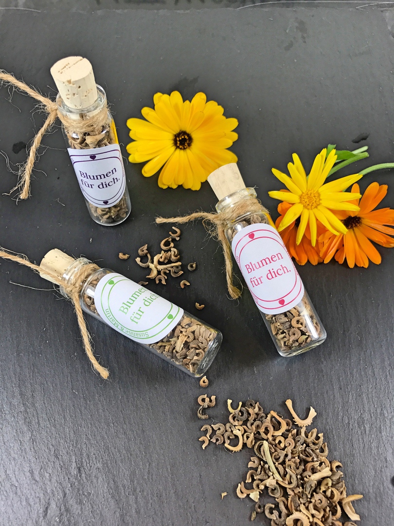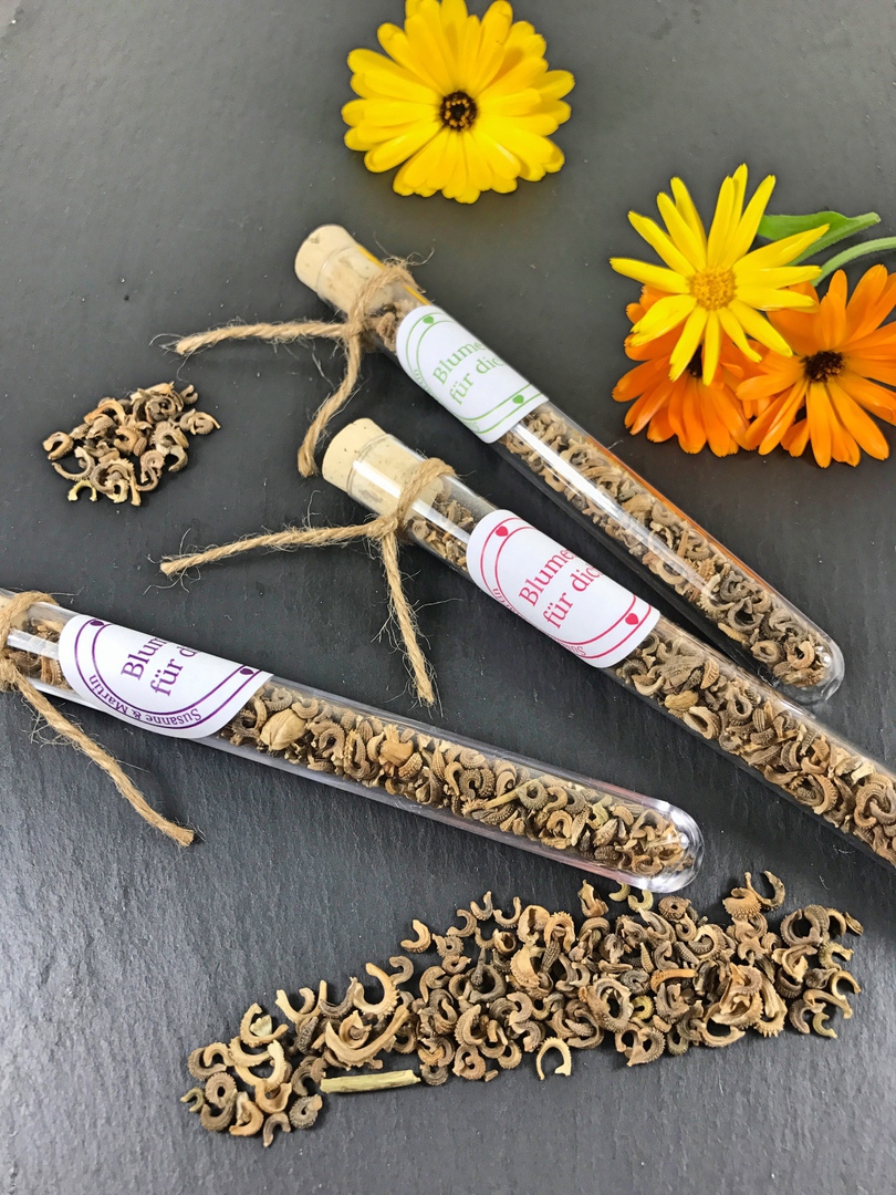 Blütezeit Mitte Juni bis September. Ringelblumen oft schneiden, um so mehr Blütenstiele treiben nach.