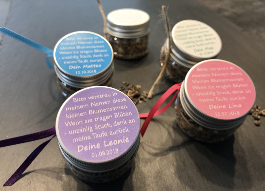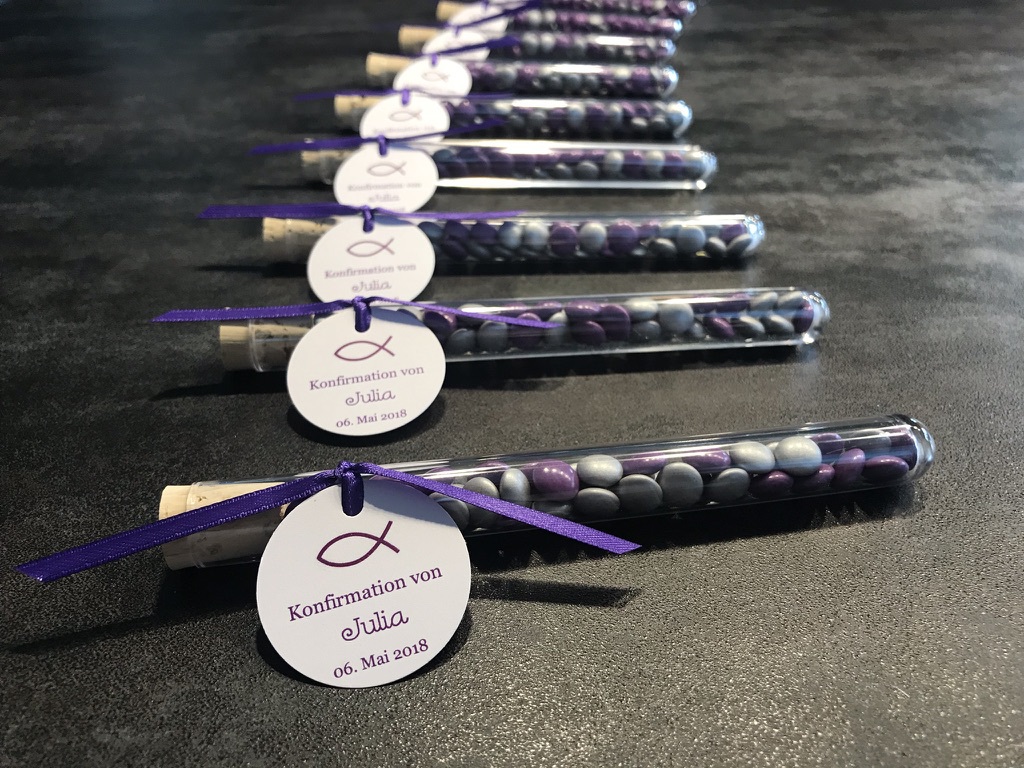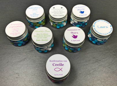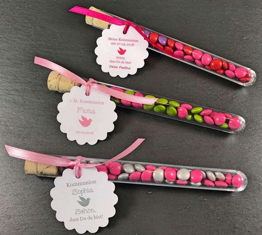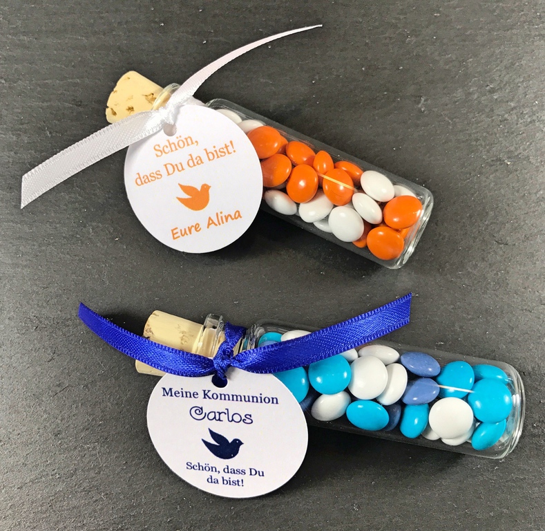 Jedes unsere Kleingeschenke können Sie Ihren Wunschdruck, Satinbandfarbe und Inhalt frei wählen.