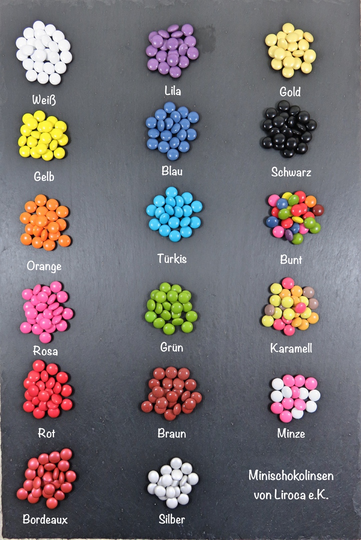 Diese Schokolinsen stehen zur Auswahl (können auch gemischt werden z.B. blau/weiß/türkis).