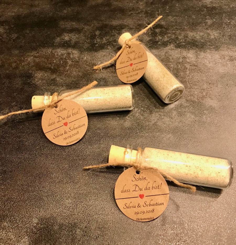 Runde Anhänger aus Kraftpapier mit dem gewohnten Wunschdruck. Gastgeschenk und Tischkarte im Naturdesign. Personalisiert und komplett fertig wird Ihnen diese geliefert.