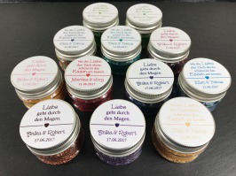 Grobkörniger Candy Zucker zum Dekorieren und Backen in 12 verschiedenen Farben. Mit einem Spruch wie "Liebe geht durch den Magen" oder "Wo die Liebe den Tisch deckt, schmeckt das Essen am besten". Schicken Sie uns gern auch Ihren eigenen Spruch bei der Bestellung. Schreiben Sie uns einfach Ihre Vorstellung vom Spruch, Schrift- und Satinbandfarbe.