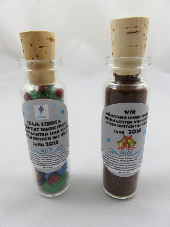 Personalisierte Wunschaufkleber auf unseren gefüllten Schiffsgläschen.