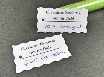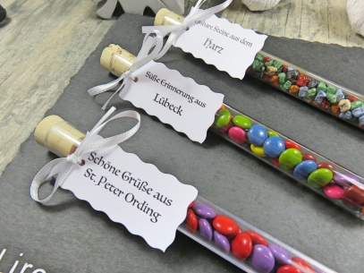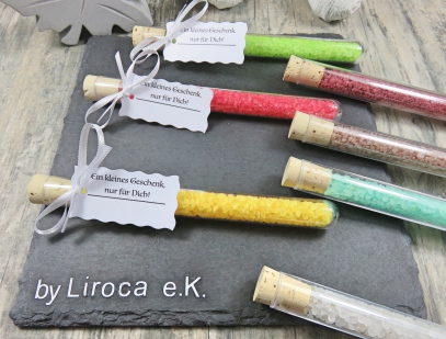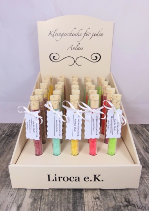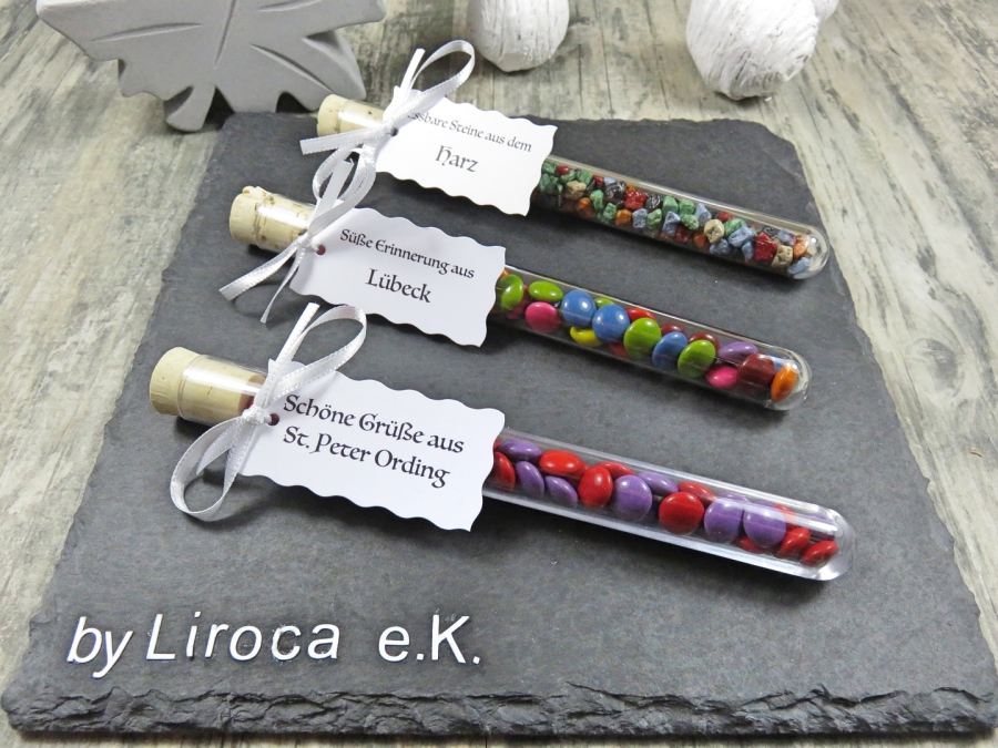 Jedes der Kleingeschenke besteht aus einem Reagenzglas 150mmx16mm Kunststoff, Korken 1A Quallität,